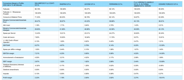 Tuttavia, Fiorucci spicca per una performance negativa, con un calo dell’EBIT margin del 16% rispetto all’anno precedente.