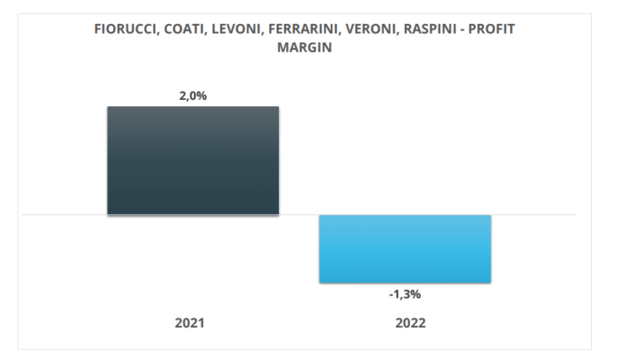 Di conseguenza, il risultato operativo è in media negativo, con un EBIT del -1,2% nel 2022, rispetto all’1,6% del 2021. Questo andamento si riflette anche nel margine di profitto, che nel 2021 era del +2%, ma nel 2022 è sceso al -1,3%, segnalando quindi una perdita netta alla fine dell’esercizio 2022 per le imprese di questo gruppo.
