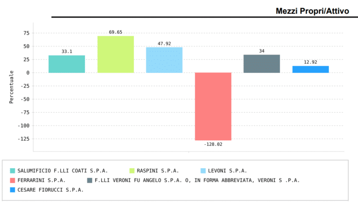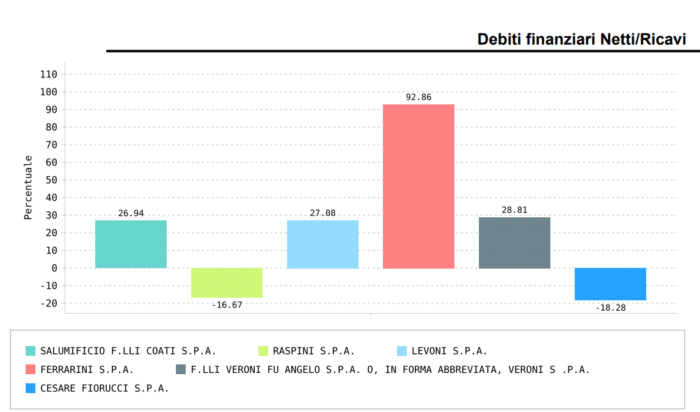 Si conferma la situazione di forte tensione sul debito per Ferrarini, mentre Raspini è nuovamente l’impresa migliore, con un debito praticamente inesistente, tanto che esprime un indice negativo pari al -17%. La stessa situazione si applica a Fiorucci, che ha un indice negativo del -18%. Le altre imprese del benchmark, ovvero Coati, Levoni e Veroni, si trovano in una posizione di assoluta tranquillità, con valori inferiori al 30%.