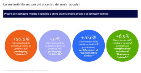 Un altro trend emergente è dedicato alla sostenibilità: per quanto riguarda il largo consumo, i dati NIQ mostrano un incremento a doppia cifra delle vendite dei prodotti con packaging riciclato o riciclabile ma anche dei prodotti caratterizzati da certificazioni di sostenibilità sociale o relative al benessere animale.