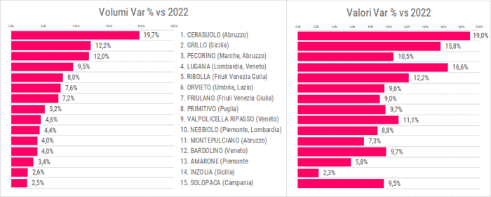 Tabella 2: Classifica delle tipologie di vini e spumanti per crescita a volume nel formato da 75cl – anno 2023