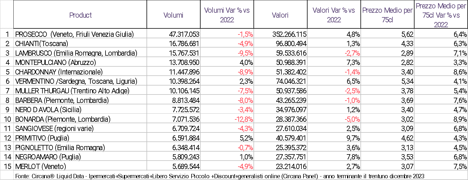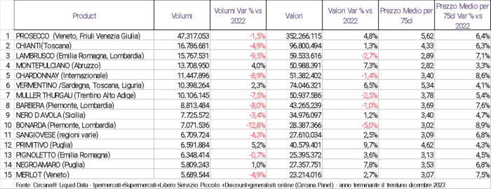 Tabella 1: vini e spumanti in bottiglia da 75cl: classifica (litri), delle tipologie di vino più vendute anno 2023
