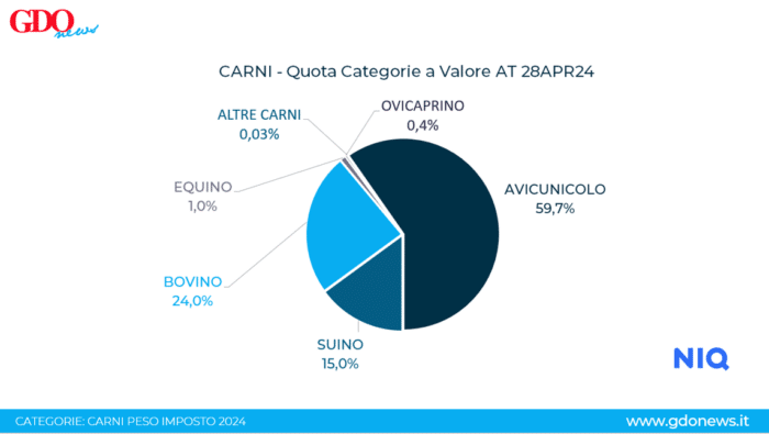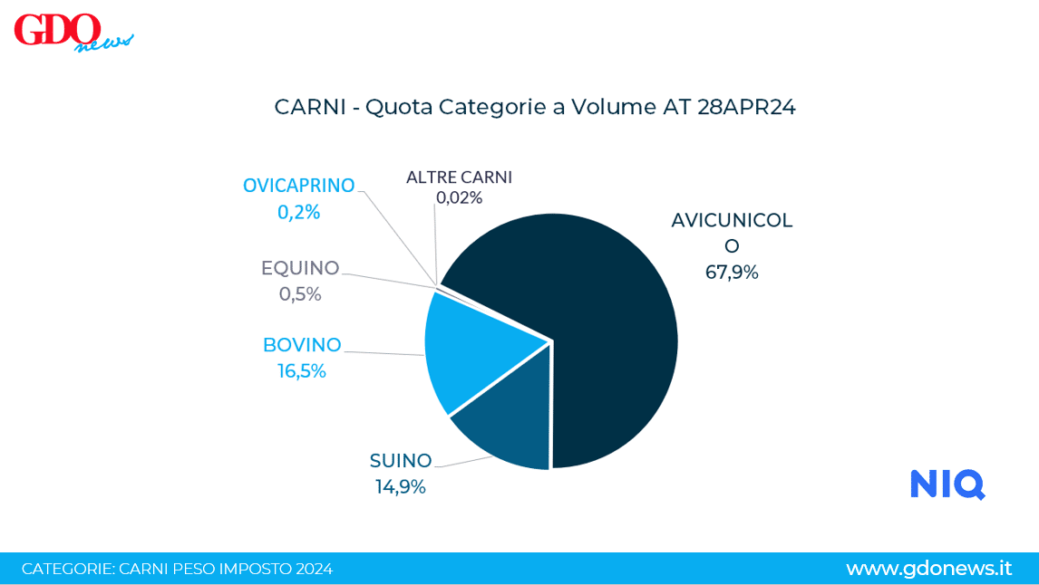 L’avicunicolo detiene il 59,7% del mercato, seguita dal Bovino con il 16,5% e dal Suino con il 15%. A volume, l’avicunicolo ha un prezzo più abbordabile e quindi una quota maggiore, pari al 68%, contro il 16,5% del Bovino e il 14,9% del Suino.