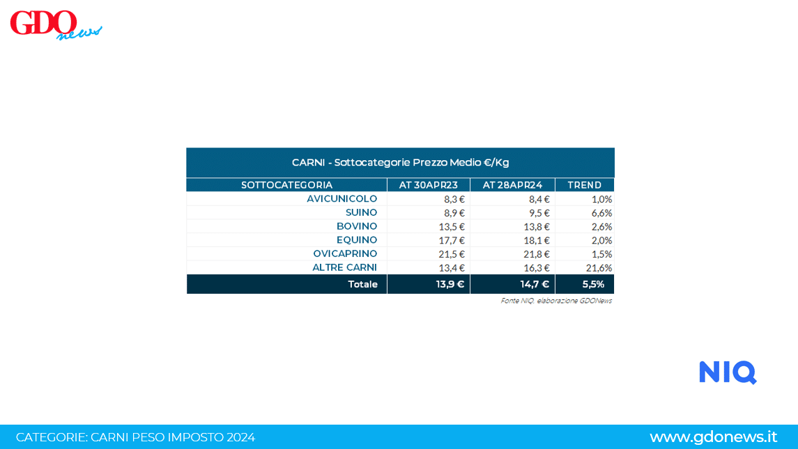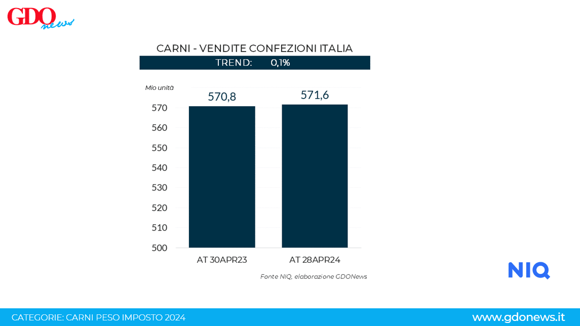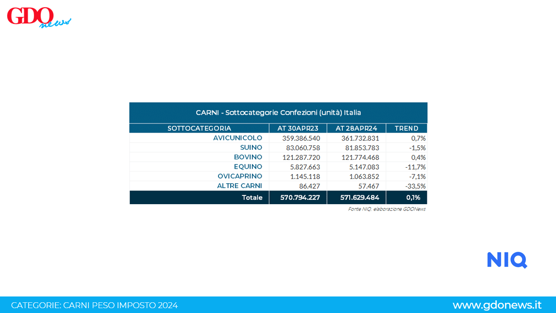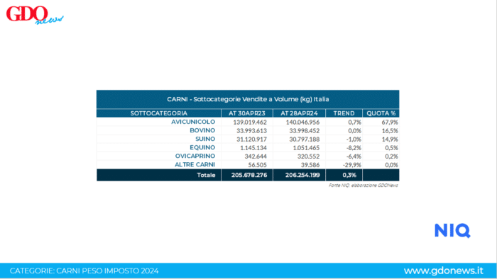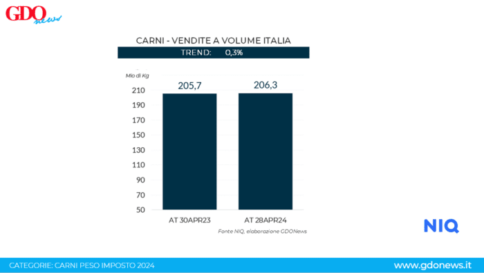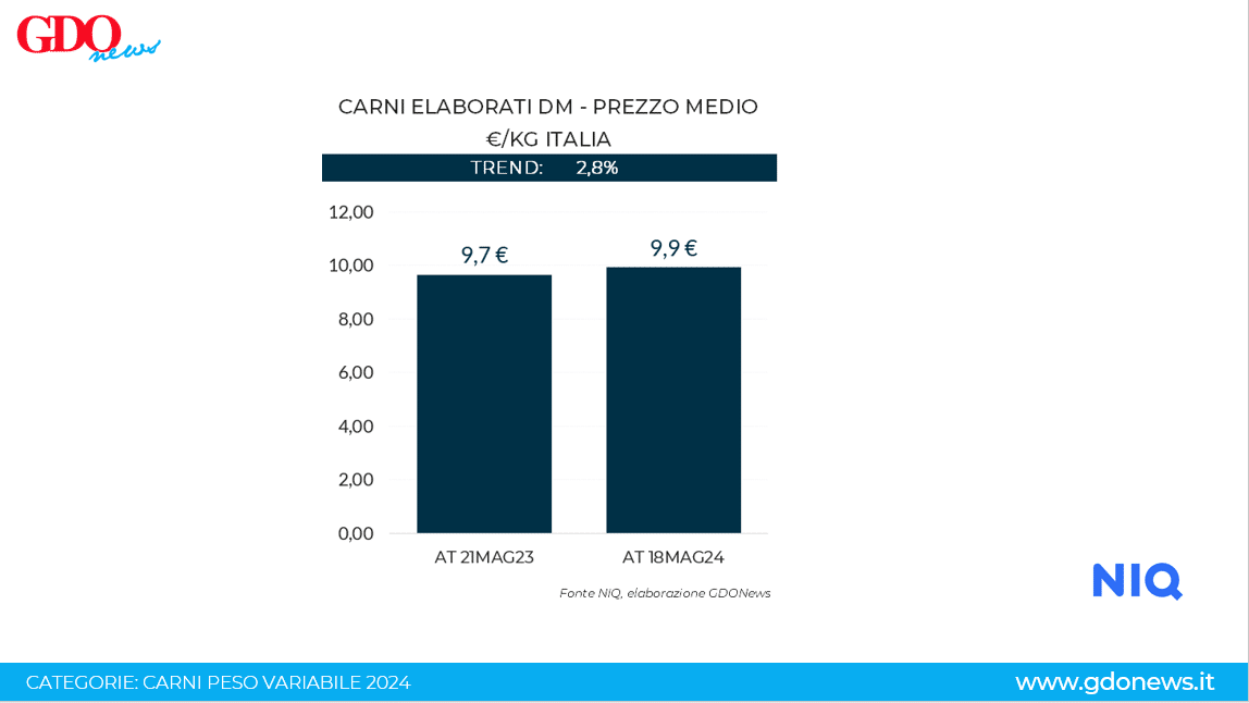 Altro dato importante: i volumi della carne a peso imposto sono stazionari, con un trend pari a zero; lo stesso vale per le vendite a confezioni. Il prezzo medio ha un trend di crescita basso, del 2,1%, indicando un’inflazione già bassa.