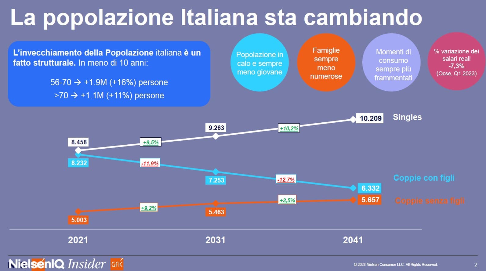 In primo luogo, è essenziale tenere presente il calo della popolazione, che sarà sempre meno giovane. Inoltre, la composizione delle famiglie italiane sta diventando sempre più ridotta in termini numerici, e a questo si aggiunge un calo del potere d’acquisto, stimato dall’OCSE in un -0,73% dal 2023 a oggi. Questi fattori contribuiscono a un consumo sempre più frammentato.
