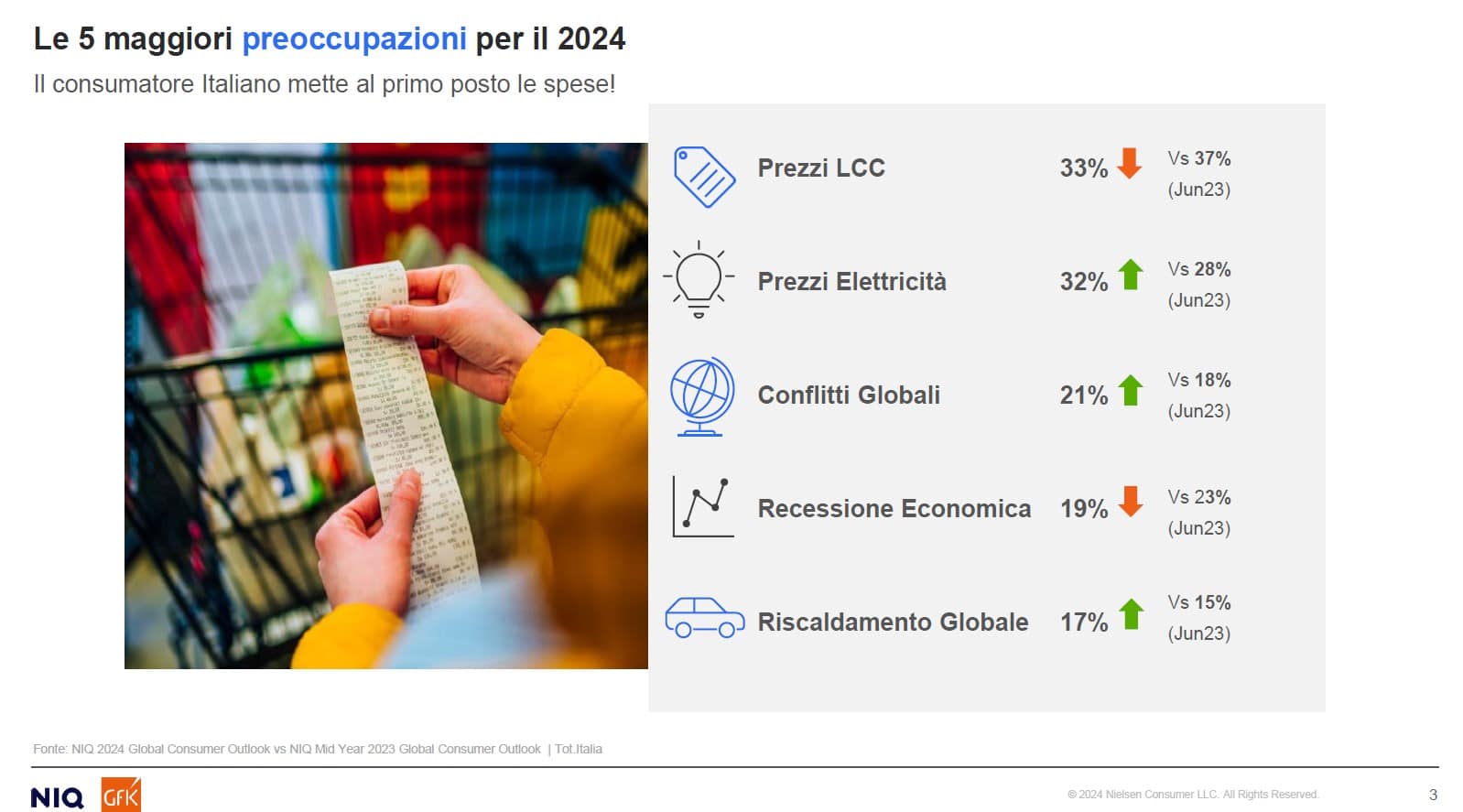Particolarmente interessante è stata la relazione di Nielsen IQ, nella parte in cui ha illustrato le dinamiche evolutive e di consumo della popolazione italiana. Una popolazione che rimane preoccupata dagli eventi economici esterni, sia a livello nazionale che internazionale.