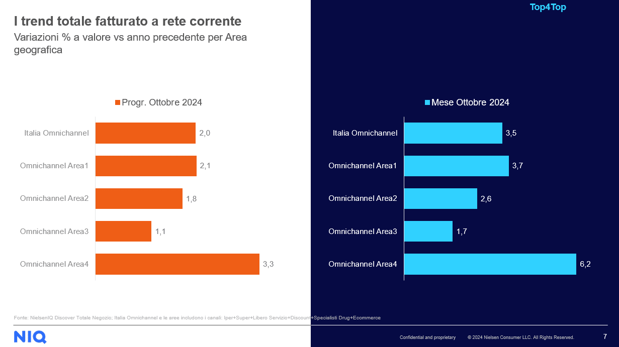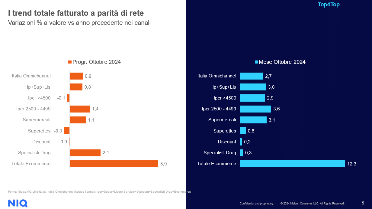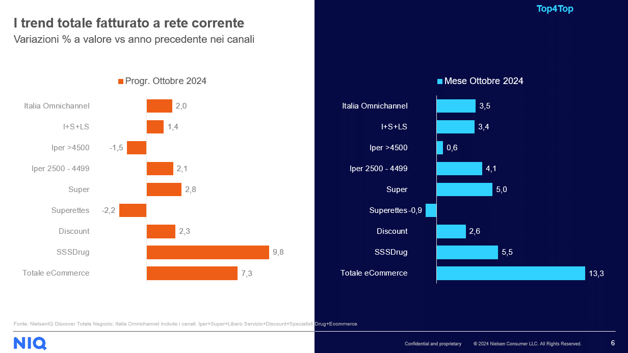 Il report Top4Top di Nielsen IQ aggiornato ad ottobre 2024 indica il dato complessivo delle vendite in Italia, considerando tutti i canali, ha segnato un incremento del 3,5%. Questo risultato è particolarmente significativo per i canali tradizionali (supermercati, ipermercati e liberi servizi), che hanno registrato una crescita del 3,4%.
