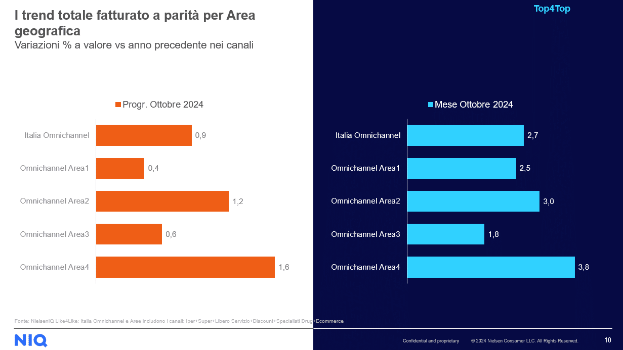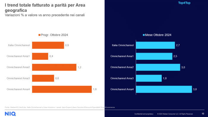 Analizzando la distribuzione geografica secondo le aree Nielsen, emerge un andamento positivo, trainato soprattutto dall’area 4, che ha registrato una crescita del 6,2% a ottobre e del 3,3% nel progressivo. L’area 1 ha segnato un +3,7% a ottobre e un +2,1% nel progressivo, mentre l’area 2 ha registrato un +2,6% a ottobre e un +1,8% nel progressivo. L’area 3 ha mostrato una crescita più contenuta, pari all’1,7% a ottobre e all’1,1% nel progressivo.