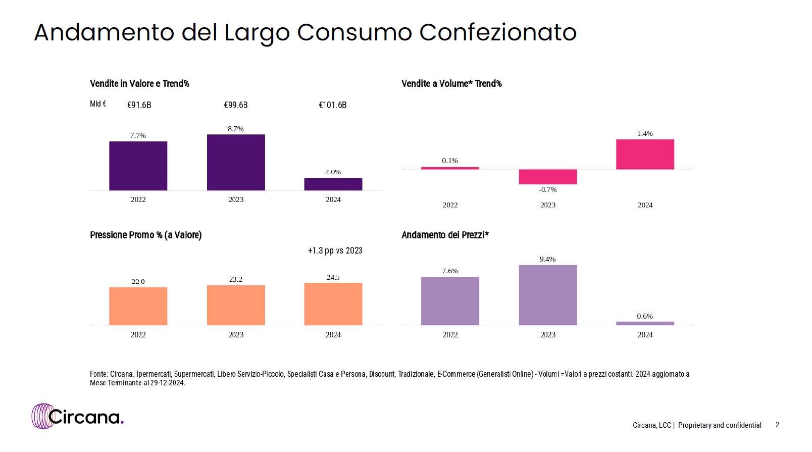 Il fatturato realizzato dal largo consumo confezionato nel 2024 ha raggiunto i 101,6 miliardi di euro, registrando una crescita del 2% rispetto al 2023. Anche le vendite a volume hanno segnato un incremento, pari all’1,4%. Questo dato è in controtendenza rispetto al 2023 e dimostra che la crescita del mercato a valore è stata trainata principalmente dall’aumento dei volumi, mentre l’impatto dell’inflazione è stato quasi nullo, come vedremo più avanti.