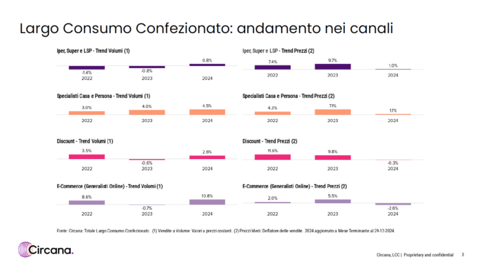 Per quanto riguarda gli specialisti casa e persona, il trend a volume è stato particolarmente positivo, con una crescita del 4,5%. Anche nei due anni precedenti questi formati avevano mostrato risultati positivi (+3% nel 2022 e +4% nel 2023). Tuttavia, nel 2024 si è osservata un’inflazione contenuta, pari all’1,1%, che ha favorito ulteriormente le vendite.