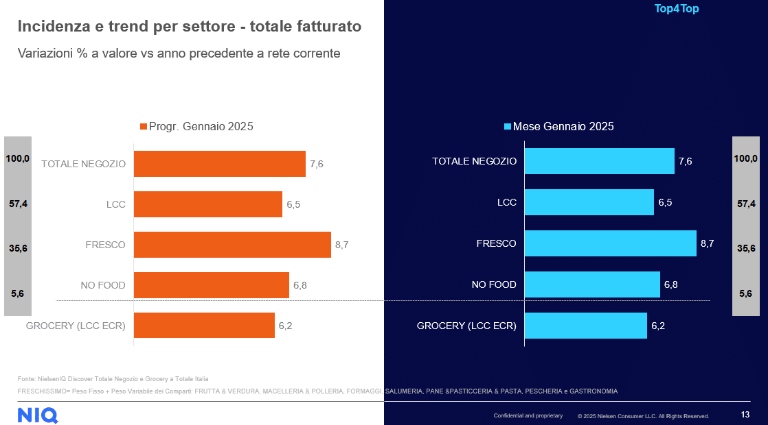 Il successo delle vendite nel mese di gennaio, riportato dalla pubblicazione del Top4Top di NielsenIQ, è stato trainato maggiormente dai prodotti freschi. Si ricorda che il dato del mese Totale Italia Omnichannel, ha segnato un incremento del 7,6%, un risultato di per sé sorprendente se si considera il regime di inflazione bassa. Tuttavia, questa crescita si scompone in un +6,5% per il Largo Consumo Confezionato (LCC) e un +8,7% per i freschi, con questi ultimi che si distanziano di oltre due punti percentuali, confermando il loro ruolo cruciale in una dinamica di mercato complessivamente positiva.
