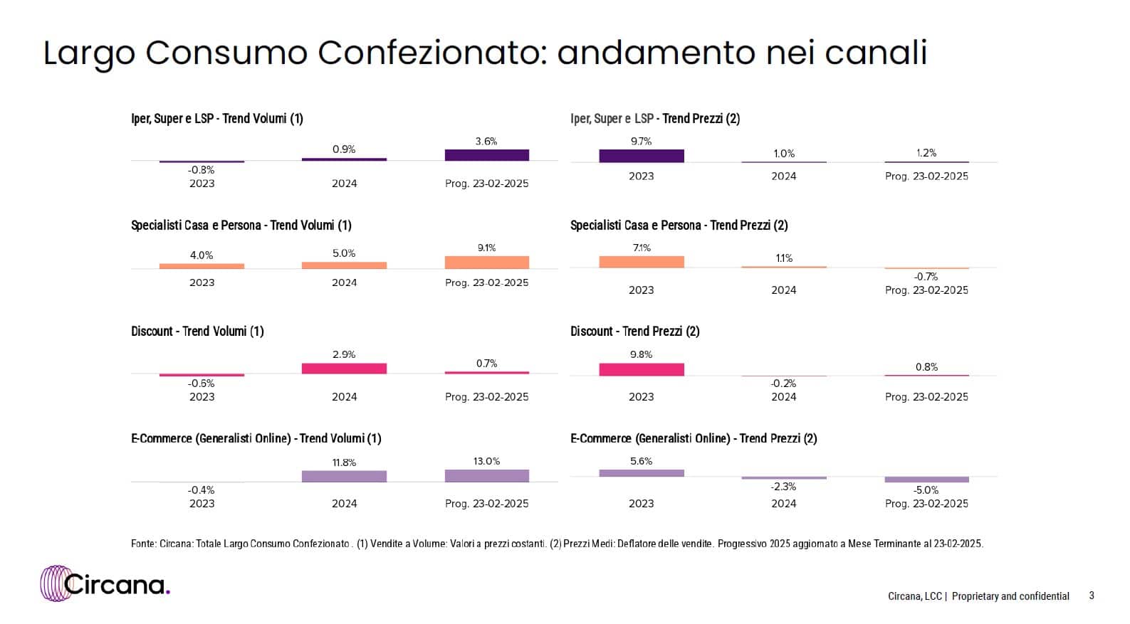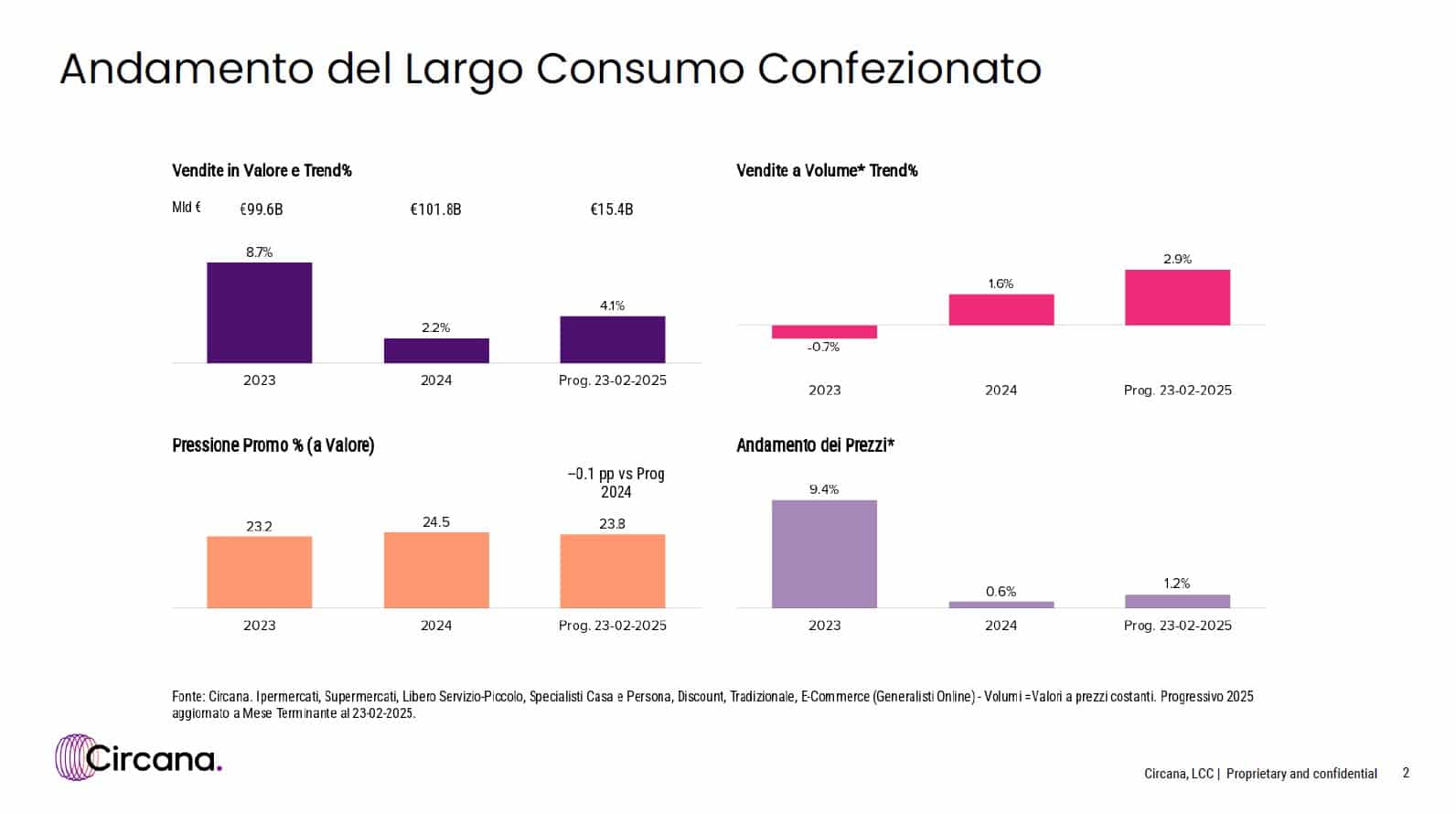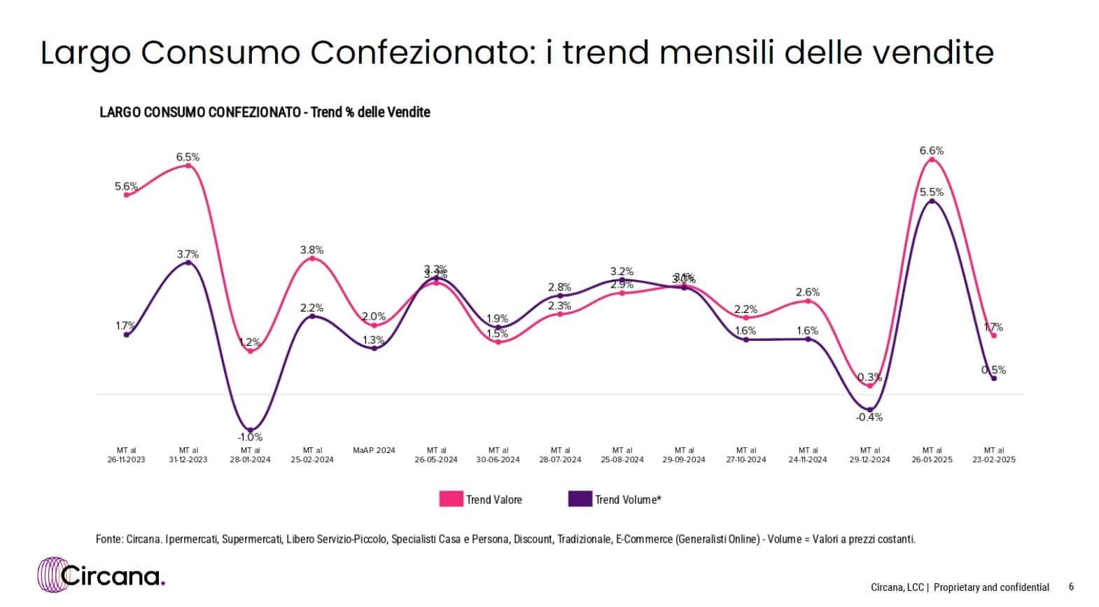Circana ha appena pubblicato l’outlook sull’LCC relativo al primo bimestre del 2025. Non emergono aggiornamenti significativi, se non la conferma di un trend positivo per il mercato della grande distribuzione, che continua a crescere mantenendo un andamento interessante.