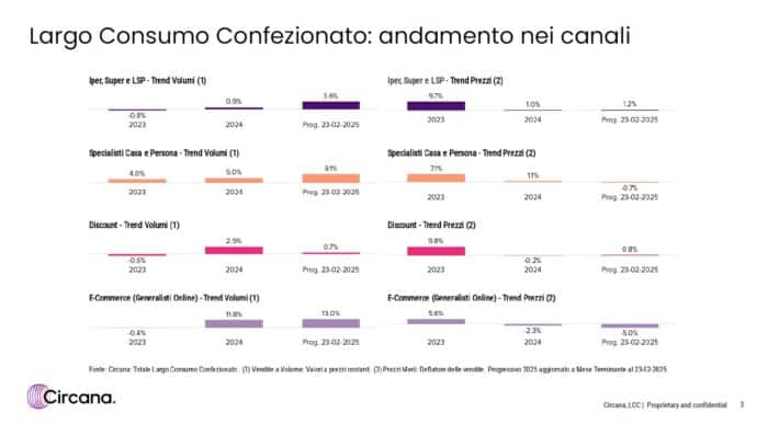 Infine, l’e-commerce continua la sua crescita in termini di volumi, ma resta caratterizzato da una forte deflazione, che si protrae anche nel secondo mese dell’anno, con una variazione negativa del -5%.