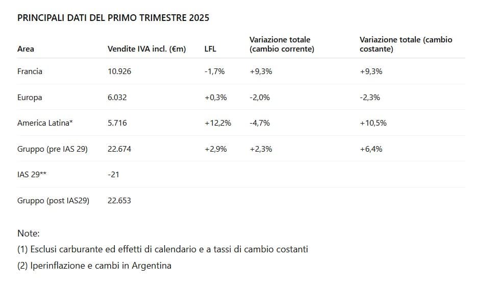 Le vendite del Gruppo, IVA inclusa, sono aumentate del +2,9% a parità di perimetro (LFL) nel primo trimestre. Hanno raggiunto i 22.674 milioni di euro (pre-IAS 29), con un incremento del +6,4% a tassi di cambio costanti.