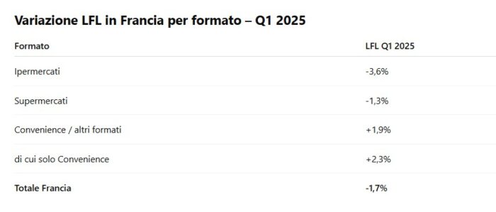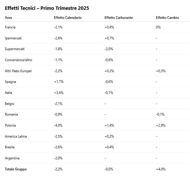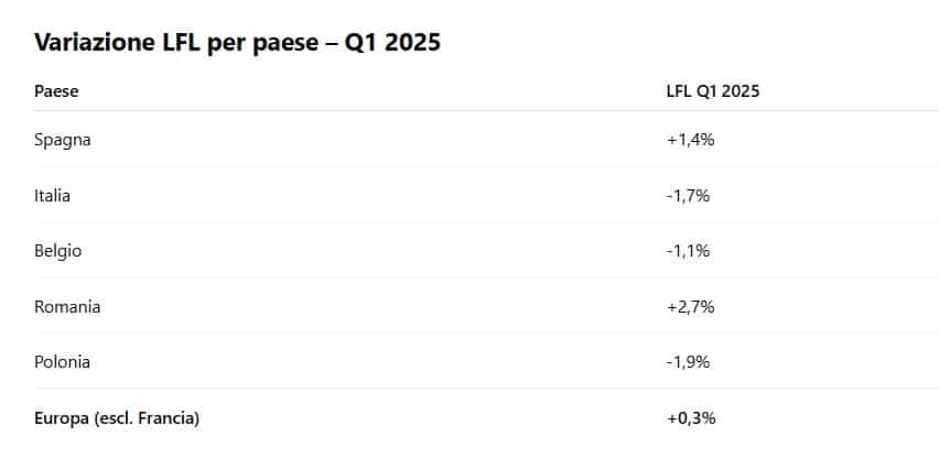 - Spagna (+1,4% LFL): Carrefour ha registrato una crescita su tutti i formati, rafforzando ulteriormente la sua dinamica positiva nel comparto alimentare (+2,5% nel Q1 contro +1,8% nel Q4 2024).