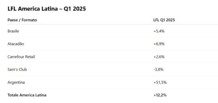 In controtendenza rispetto al mercato europeo, la Spagna si distingue per una crescita LFL positiva dell’1,4%, grazie a una performance solida soprattutto nel comparto alimentare. Ma è il Brasile a trainare i risultati del Sud America, con una crescita del +5,4% LFL e una performance superiore al mercato da parte di Atacadão, che segna un +6,9%.