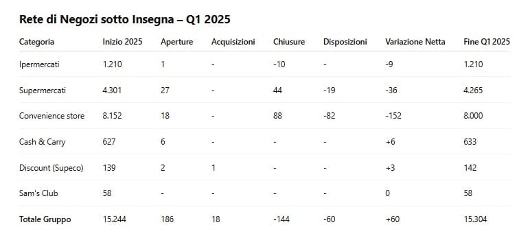 Le vendite sono cresciute del +0,3% LFL, con un +0,9% nel comparto alimentare che ha compensato il calo del -2,9% nelle vendite non alimentari.