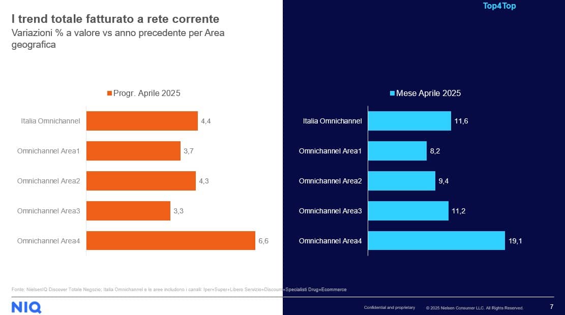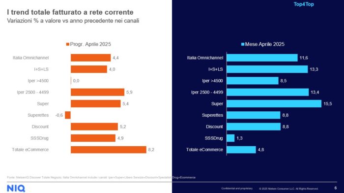Osservando il progressivo annuo da gennaio ad aprile 2025, si evidenzia una crescita complessiva del +4,4% Italia Omnichannel. L’e-commerce si posiziona come segmento con la variazione più alta (+8,2%), seguito dai Supermercati (+5,4%), Iper 2500–4499 mq (+5,9%) e Discount (+5,2%). Il canale Iper >4500 mq è stabile (+0,0%), mentre le Superette registrano una contrazione dello 0,6%.