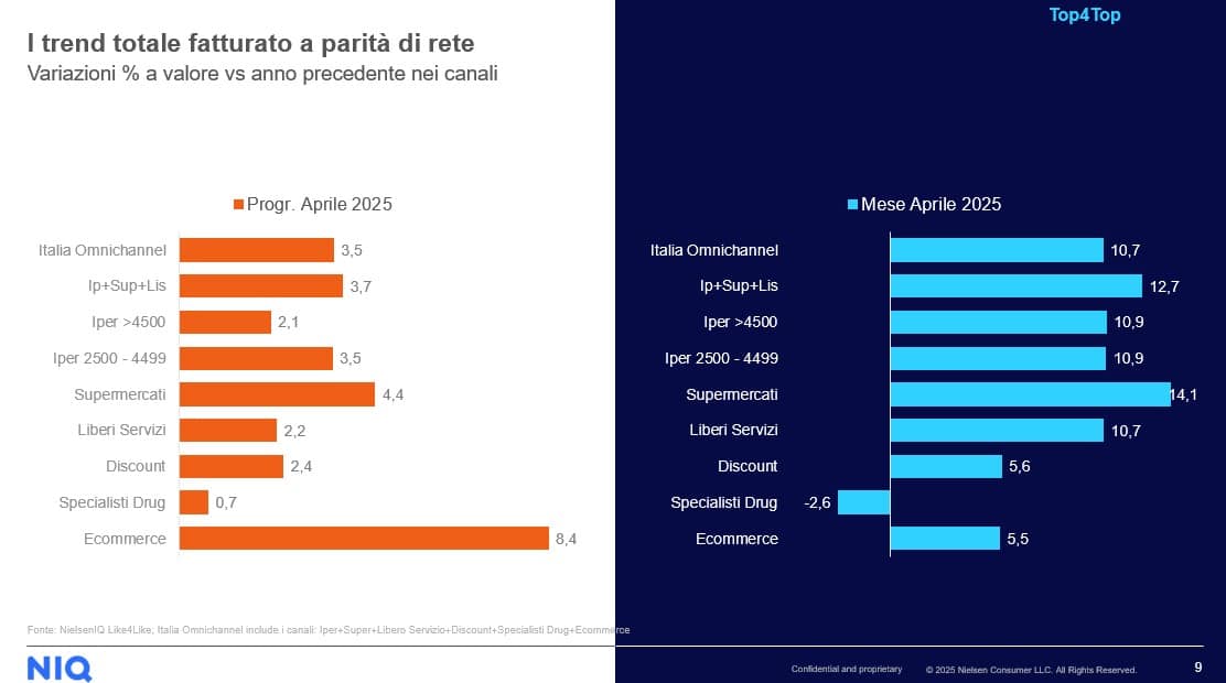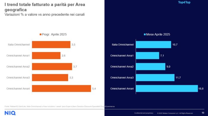 Per quanto riguarda l’analisi a parità di rete (like-for-like), il mese di aprile segna un incremento del +10,7% per il totale Italia omnichannel. Ancora una volta i Supermercati risultano il canale più dinamico (+14,1%), seguiti dai formati iper (entrambi +10,9%). Il canale eCommerce mostra una variazione del +5,5%, mentre il Discount registra un +5,6%. Il segmento Specialist Drug evidenzia una variazione negativa pari al -2,6%.