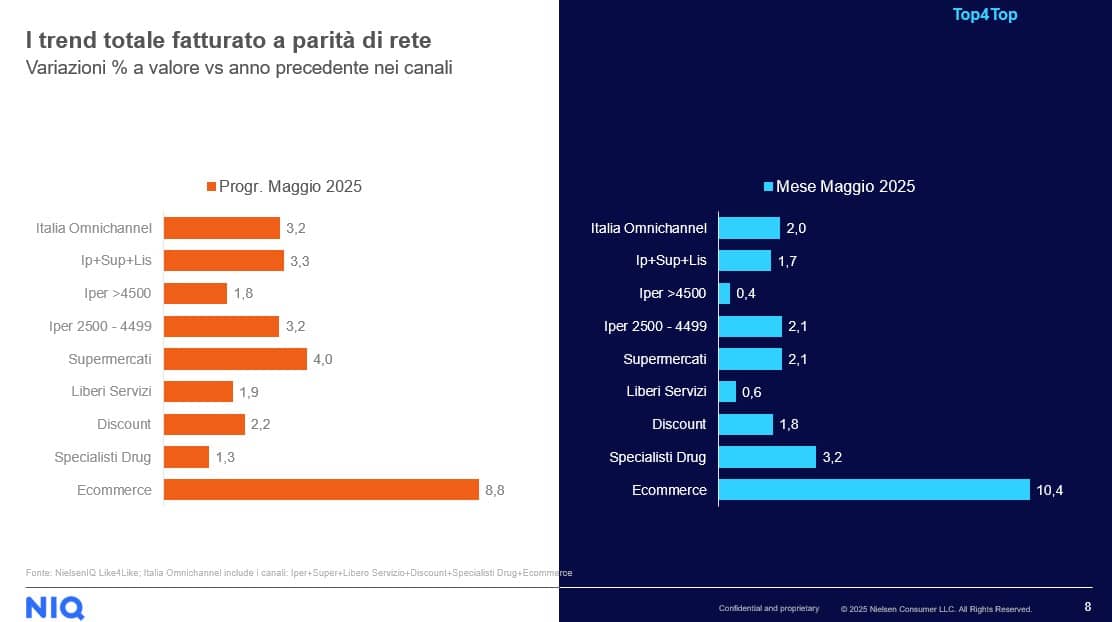 Impressionante, invece, la performance dell’eCommerce, che mette a segno un +8,8% progressivo e un +10,4% nel solo mese di maggio. È una crescita che non ha eguali nel panorama della GDO e che dimostra come il canale digitale non sia più un’alternativa, ma una componente strutturale del retail. La sua crescita a parità di rete dimostra che non si tratta solo di nuovi utenti, ma di una fidelizzazione crescente, spinta da efficienza logistica, interfacce sempre più user-friendly e politiche promozionali aggressive.