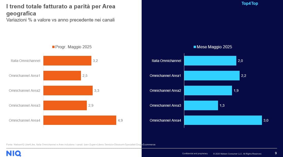 A livello territoriale, il quadro rimane disomogeneo: la miglior performance si registra in Area 4 (+4,9% progressivo e +3,0% nel mese), mentre le altre aree si mantengono tra il +2,5% e il +3,3%. Nessuna regione è in contrazione, ma il messaggio è chiaro: la crescita reale avviene solo dove i modelli distributivi hanno saputo adattarsi alla nuova normalità.