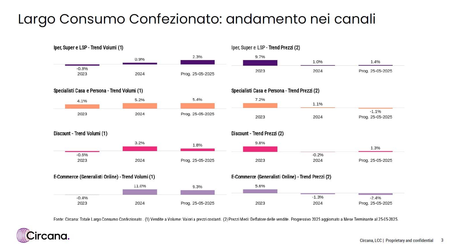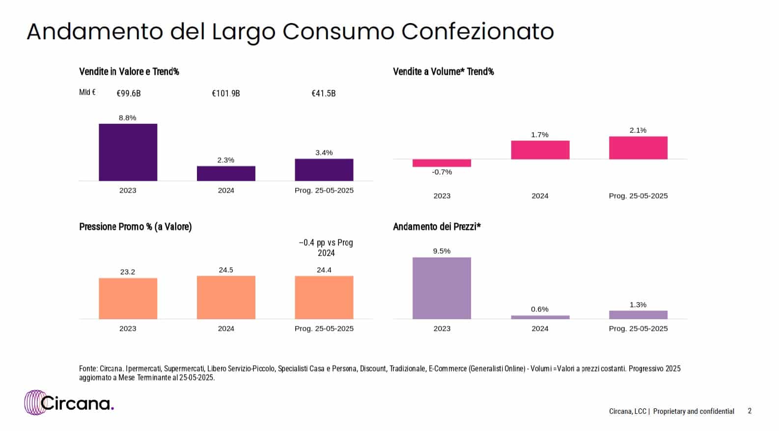 In questa nuova lettura del comparto, i dati aggiornati al maggio 2025 offrono spunti cruciali: il ritorno alla crescita dei volumi, la progressiva normalizzazione dell’inflazione, l’esplosione dell’e-commerce, la ritrovata centralità della GDO tradizionale e la riconfigurazione delle strategie promozionali.