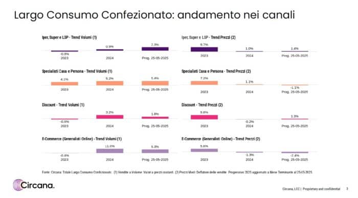 Iper, super e libero servizio piccolo tornano a crescere, passando da un -0,8% del 2023 a un +2,3% di volumi nel 2025, con una gestione dei prezzi sotto controllo (+1,4%). I discount, pur in recupero, non dominano come ci si sarebbe aspettati: dopo un -0,6% nel 2023, tornano a crescere del 3,2% nel 2024 ma rallentano a +1,8% nel 2025. Gli specialisti casa e persona registrano performance straordinarie con un +5,4% di volumi nel 2025 e una deflazione mirata che li rende molto competitivi.