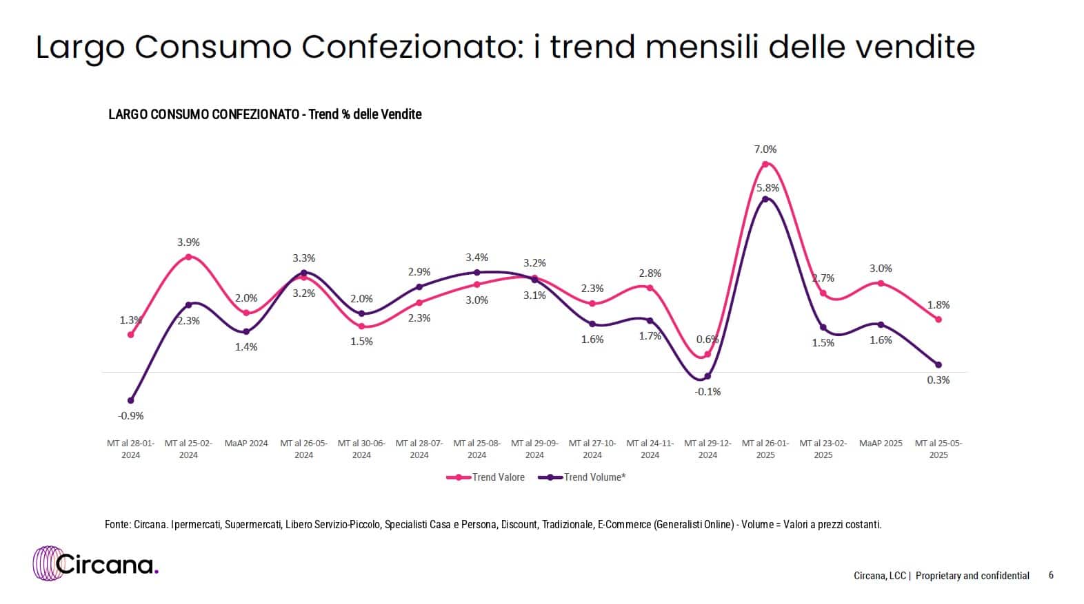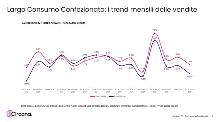 A partire dal 2024 si osserva un’inversione di tendenza: le vendite a volume, che erano negative a inizio anno, cominciano progressivamente a risalire, fino a toccare il picco di gennaio 2025, quando si registra un +5,8% a volume e un +7,0% a valore. Un dato che testimonia un ritorno di fiducia del consumatore, spinto probabilmente da promozioni efficaci, assortimenti rinnovati e una percezione di convenienza finalmente reale.