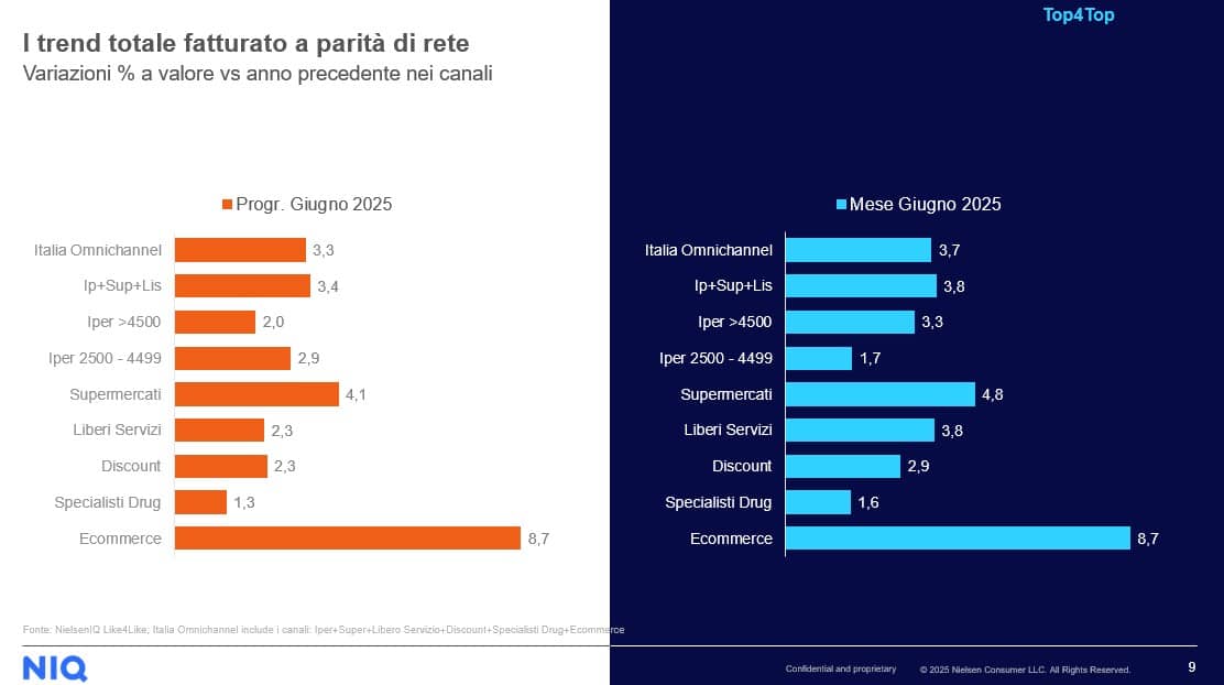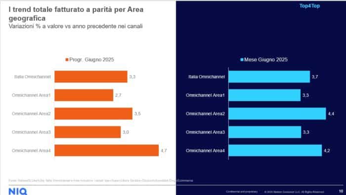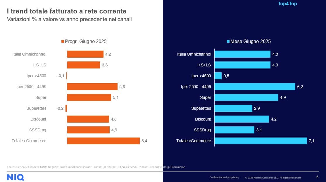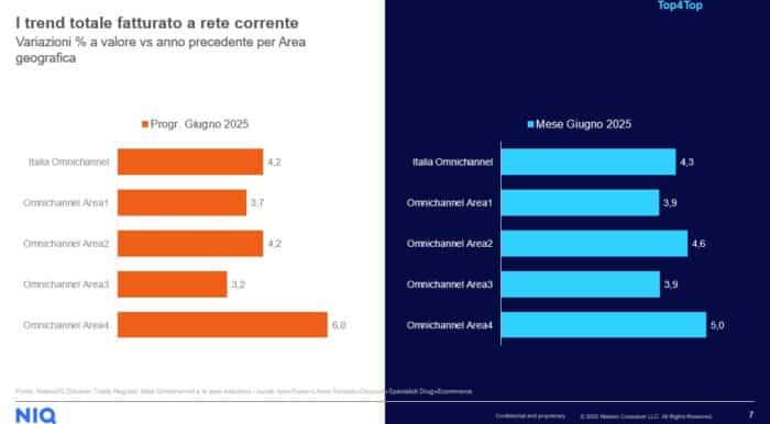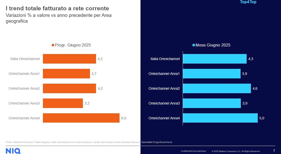Analizzando il mercato a parità di rete – ovvero considerando soltanto i punti vendita già presenti nel periodo di confronto – i dati restano comunque positivi: la crescita delle vendite in Italia nel solo mese di giugno è pari al +3,7%, mentre il dato progressivo annuale (aggiornato a fine giugno 2025) si attesta a +3,3%.
