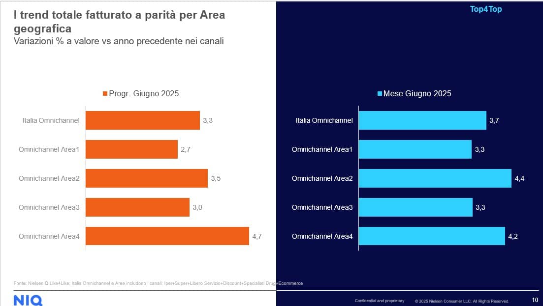 Guardando la distribuzione territoriale delle vendite, è ancora una volta il Sud Italia (Area 4) a trainare la crescita a livello nazionale. Il quadro, tuttavia, è positivo anche nelle altre macroaree: l’Area 2 (Centro Italia) registra una buona performance sia nel mese di giugno che nel progressivo, mentre Area 1 (Nord-Ovest) e Area 3 (Nord-Est) mostrano crescite più contenute. Va segnalato che tra l’Area 3 e l’Area 4 si registra quasi un differenziale di tre punti percentuali, a conferma del contributo trainante del Sud.