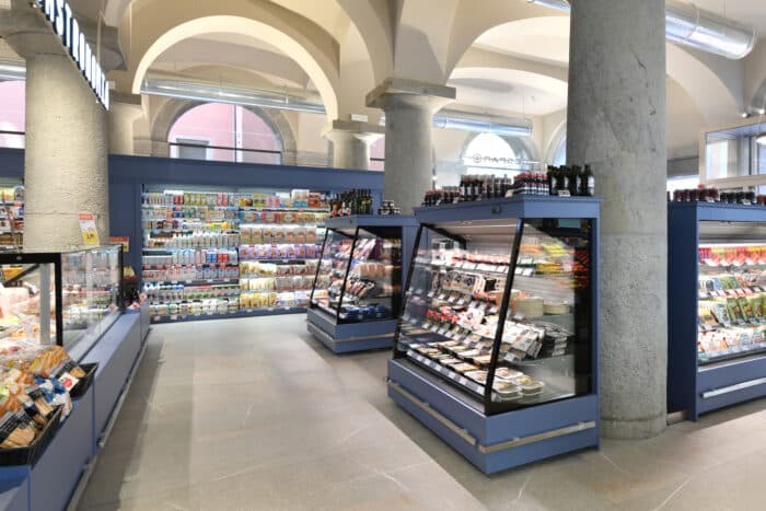 Tutti gli impianti sono stati integrati in modo armonico, con una particolare attenzione all’efficienza energetica, al design e alla sostenibilità. Vetrine, banchi frigo e altri elementi di arredo sono stati scelti e personalizzati per adattarsi allo stile dell’edificio, creando un ambiente accogliente, raffinato e coerente con l’identità del luogo.